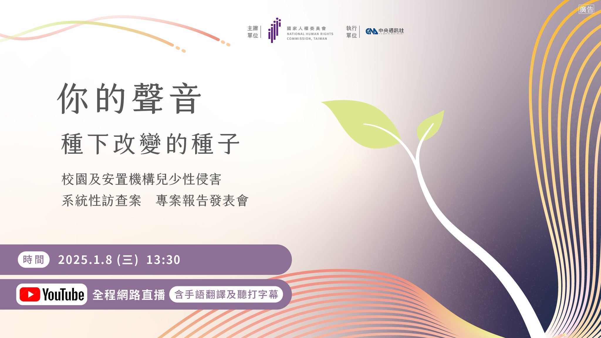 活動名稱【國家人權委員會】「你的聲音種下改變的種子」專案報告發表會 (1/8)活動簡介過去十年,超過一半的性侵害受害者是未成年人。那些原本應該最安全的地方——學校和安置機構,卻成了他們的噩夢。學校的教室、社團活動的教室、甚至是老師家裡,都可能成為性侵害發生的地點。為了讓受害者聲音被聽見,本會邀請曾經在兒少時期於校園或安置機構遭受性侵害的人參與訪談,透過訪談,了解結構性的問題、加害人的模式等,並探索可行的解決方案。期望不僅是預防和辨識,更要提高所有人的意識,讓兒少的聲音都能被聽見,危機能被阻止。每一句揭露,都是意義重大的聲音,這不只是受訪者兒少時期的故事,更是我們所有人的責任。竭誠邀您線上觀看同在!活動資訊活動日期:2025年1月8日 星期三,下午13:30活動地點:Youtube頻道全程網路直播活動對象:一般大眾活動主辦單位:國家人權委員會詳細資訊:更多詳細資訊請參考網站公告 👉🏻 前往網站