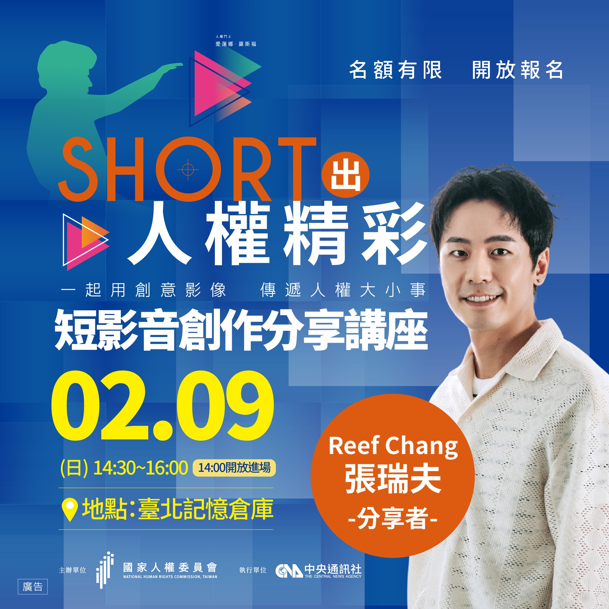 活動名稱【國家人權委員會】Short出人權精彩 - 2024人權短影音創作競賽 分享講座 (2/9)活動簡介本次短影音創作分享講座邀請到萬秀洗衣店第三代、萬秀洗濯實驗室負責人張瑞夫,與大家分享面對不同影音題材時,短影音的創意發想、剪輯吸睛撇步還有短影音實例分享。 藉由分享,希望大眾在構思人權相關議題時,可以有許多創意思考,傳遞人權理念。活動資訊講師介紹:張瑞夫活動日期:2025年2月9日 星期日 ,14:30 - 16:00(14:00入場)活動對象:一般大眾活動地點:台北記憶倉庫(台北市中正區忠孝西路一段265號2樓)活動主辦單位:國家人權委員會詳細資訊:更多詳細資訊請參考網站公告 👉🏻 前往網站
