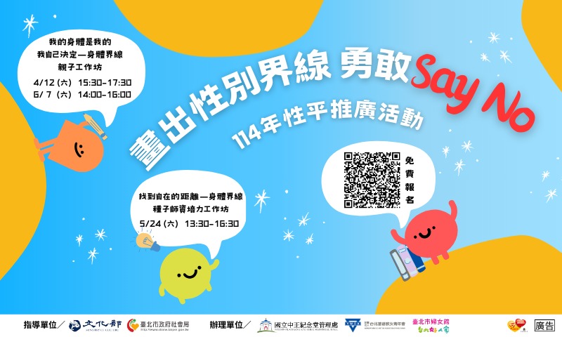 活動名稱【國立中正紀念堂管理處】「畫出性別界線,勇敢Say No」114年性平推廣活動 (5/24、6/7)活動簡介為落實推動聯合國性別平等永續發展目標與落實行政院持續推動性平三法修法通過等政策,並呼應行政院性別平等會提出「推動性別平等政策綱領」與「落實消除對婦女一切形式歧視公約(CEDAW)」工作目標,114年與臺北市婦女館合辦規劃「畫出性別界線,勇敢Say No」性平推廣活動,透過工作坊及親子活動,引導家庭照顧者與教育者對兒童性平教育、自我表達能力及自我保護的重視。活動資訊講師介紹:陳東玉 老師 (秘蜜基地繪本屋創辦人、臺北婦女館性平教材《性別有界線著色本》顧問)活動日期:2025年5月24日、6月7日活動對象:親子活動(4/12及6/7場次)對象為親子組,一組名額即一大一小2人,小孩年齡3-6歲或7-10歲;工作坊(5/24場次)依報名順序錄取,報名者為博物館、美術館、教職人員、文化事業領域工作者。活動地點:中正紀念堂圖書室(3展廳內)活動主辦單位:國立中正紀念堂管理處詳細資訊:更多詳細資訊請參考網站公告