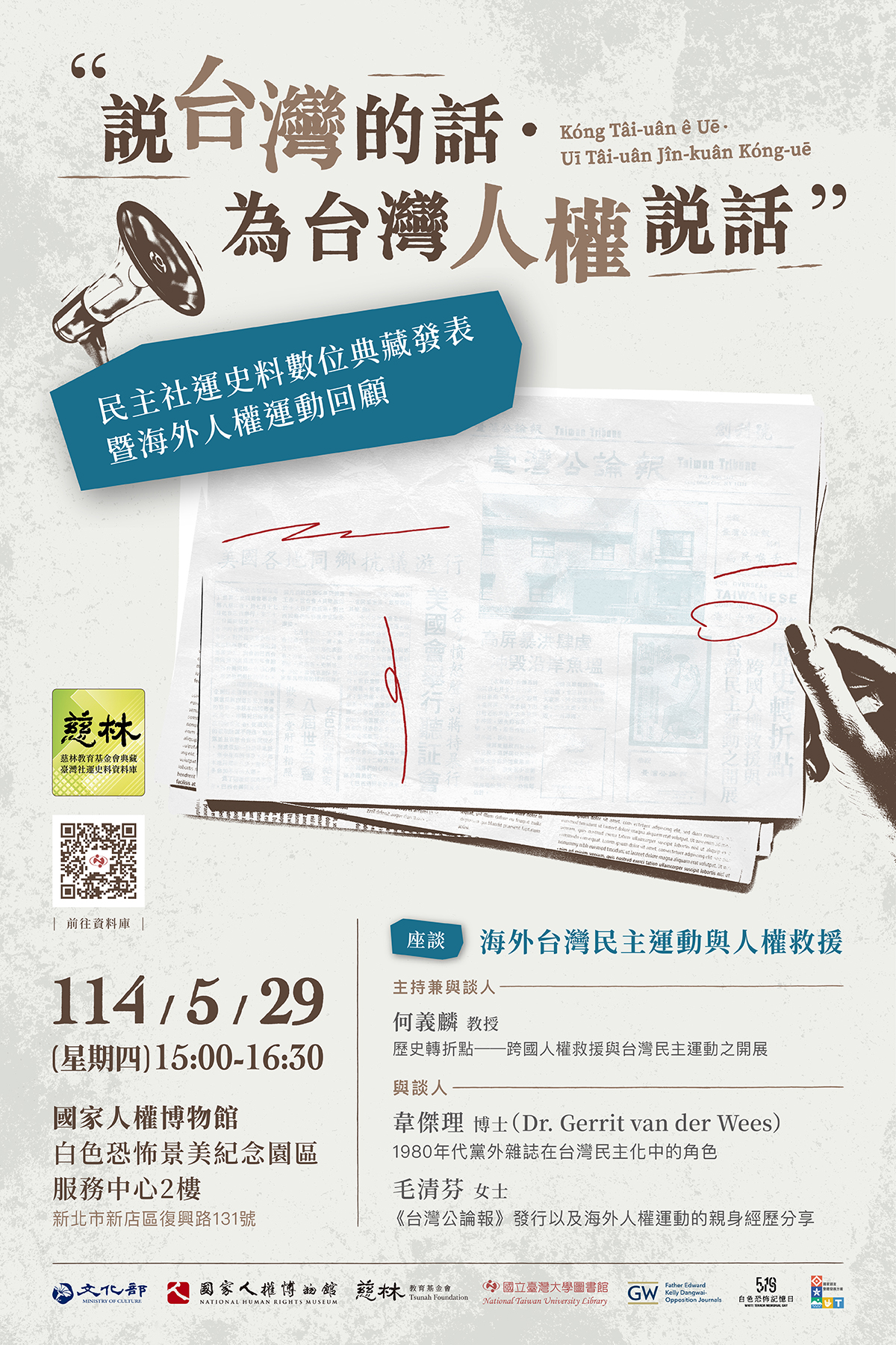 活動名稱【國家人權博物館】「說台灣的話˙為台灣人權說話」發表暨座談會 (5/29)活動簡介從1975年至1990年間海內外台灣人權救援的雜誌數位化成果,讓大家可從國際視角瞭解當時海內外臺灣人權救援之經過。本場次主持人將以 台語+英語雙語口譯 進行全場主持,用語言向曾在海外為台灣發聲的留學生致敬!活動資訊講師介紹: