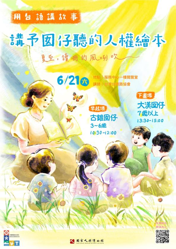 活動名稱【國家人權博物館】講予囡仔聽的人權繪本 (6/21)(6/15截止報名)活動簡介「夏至,讀冊的風咧吹~」這個夏天,國家人權博物館邀請大小朋友一起進入台語的繪本世界!語言不僅是溝通的工具,它更承載著文化與記憶,而母語則是連結內心情感與童年回憶的橋樑。為了讓更多家長與孩子能在母語的環境中學習、討論人權議題,並將人權繪本及兒童人權理念帶進「台語家庭」,人權館策劃了「用台語講故事:講予囡仔聽的人權繪本」系列活動。此次活動將與「台灣台語路協會」合作,由專業故事講師以全台語朗讀方式講述故事,讓孩子們透過母語認識繪本,學習人權。當故事不再只是紙上的文字,而是貼近生活的聲音,它便成為孩子們可以「感覺」的語言。在母語的滋養中,這些故事將在孩子的心中種下人權教育的樹苗,並讓這些理念在孩子們的成長過程中深耕茁壯。「用台語講故事:講予囡仔聽的人權繪本」活動將於6月21日登場,活動分為「早起場:古錐囡仔」與「下晝場:大漢囡仔」,兩場次分齡選書,朗讀多本台文繪本,從本土出發,講述台灣的故事;同時,配合夏至節氣,將朗讀與夏天相關的故事,並搭配台語唸謠,讓孩子們在輕鬆有趣的故事活動中了解兒童人權。此外,活動當日亦將展出多本兒童人權繪本,包括《不是我的錯》、《說好不要哭》、《我是小孩,我有權利》、《和平與戰爭》等人權繪本,以及《熱天的時陣》、《我會曉》、《咱的日子:我們的日常》等台文繪本,邀請親子共同閱讀,帶著故事的風一起迎接盛夏。活動資訊講師介紹:台灣台語路協會講師活動日期:2025年6月21日 星期六,
