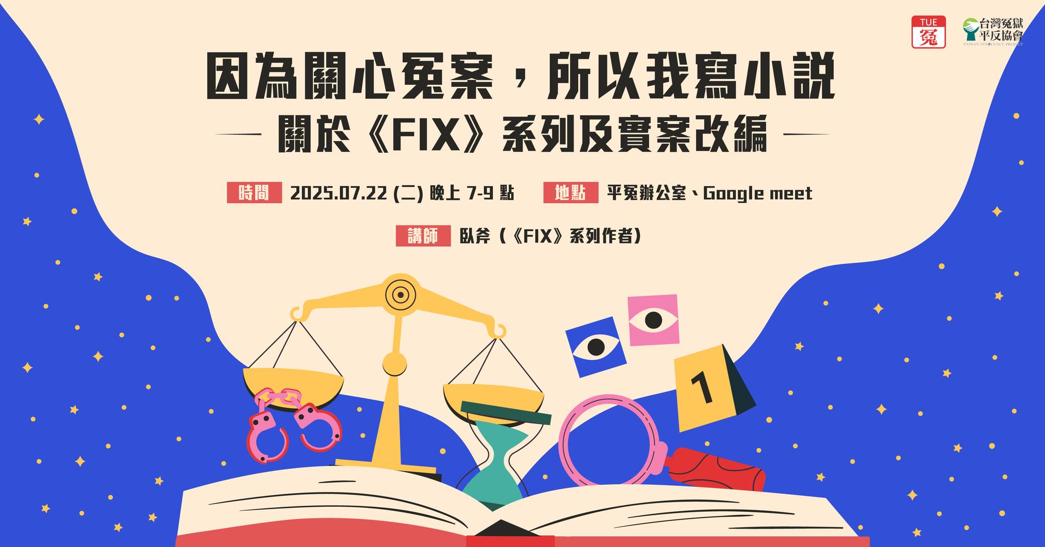 活動名稱【台灣冤獄平反協會】因為關心冤案,所以我寫小說-關於《FIX》系列及實案改編 (7/22)活動簡介小說家臥斧於2017年推出推理小說《FIX》,書中收錄7篇改編自台灣真實司法冤錯案件的故事。2024年,他再次改編另外7起冤案,推出《FIX 2》。臥斧曾言,冤案的判決書如同一篇寫壞了的推理小說,證據不穩固、情節不合理;但與虛構不同的是,現實中的冤案被害人卻真真切切地失去自由,甚至失去生命。作為小說家,他透過創作呈現判決中的疑點,並試圖以更貼近大眾的文字修補司法缺口,如同書名《FIX》正寓意著修理、補齊與校準。《FIX》的創作起點始於2016年,臥斧透過廢死聯盟接觸到鄭性澤案,深入理解其中疑點後,開始以真實冤案為素材展開小說創作。2017年,他曾在冤Tue.分享改編謝志宏案的經驗;2025年,我們再度邀請他攜《FIX 2》回到冤Tue.,與我們分享他如何從資料整理、情節鋪陳到倫理抉擇,將一樁樁冤案化為小說?這14起真實冤案,在現實世界中又有哪些重要的進展?活動資訊講師介紹:臥斧(《FIX》系列作者)活動日期:2025年7月22日 星期二,18:45實體進場,18:50線上進場,19:00開始活動地點:台北市大安區辛亥路二段165號7樓 (平冤辦公室)、Google meet (線上)活動對象:一般大眾活動主辦單位:台灣冤獄平反協會詳細資訊:更多詳細資訊請參考網站公告