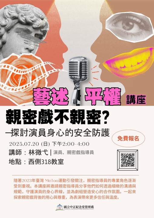 活動名稱【國立中正紀念堂管理處】親密戲不親密?探討演員身心的安全防護 (7/20)活動簡介親密戲該如何拍攝,才能讓演員感到安全與被尊重?隨著2023年臺灣MeToo運動引發關注,親密指導員的專業角色逐漸受到重視。本講座將邀請親密指導員分享他們如何透過細緻的溝通與規範,守護演員的身心界線,並為劇組營造安心的合作氛圍。一起來探索親密戲背後的用心與尊重,為表演帶來更多信任與溫度。活動資訊講師介紹:林微弋 (演員、親密戲指導員)活動日期:2025年7月20日 星期日,下午14:00 - 16:00活動地點:中正紀念堂3樓W318教室活動對象:一般大眾活動主辦單位:國立中正紀念堂管理處詳細資訊:更多詳細資訊請參考網站公告