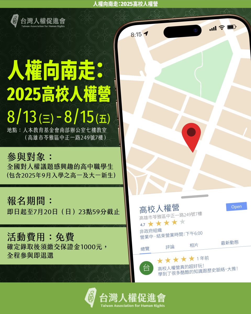 活動名稱【台灣人權促進會】人權向南走:2025高校人權營 (8/13~15)(7/20截止報名)活動簡介「不住在台北,我還能做些什麼?」「只是轉發一則新聞,感覺就會被貼上『太正經』『太敏感』的標籤……」我們知道,走出了都市,關心議題從來不簡單。 這就是為什麼我們設計了2025高校人權營,讓你從自己的地方出發,成為改變的一部分。三天兩夜的營隊,有屏東青年團體「大屏共讀」分享閱讀怎樣結合在地行動,實地走訪高雄勞工博物館,看見南部工運與產業變遷的歷史足跡,劇場工作坊,重新感受自己與地方的連結,擴展對行動的想象,隱私權、資訊安全、難民、集會遊行和漁工議題課程,給你最扎實、最在地的人權議題知識。行動培訓和議題社群貼文實作,練習說出你的觀點,讓關心議題不再只是單向輸入。在這裡,你能串連其他地方青年、學習人權議題、找到行動的可能。2025 高校人權營,不只是營隊,更是一群「對社會有感的人」的起點,一起從南活動資訊活動日期:2025年8月13日(三)至15日(五),四天三夜含住宿。活動對象:全國對人權議題感興趣的高中職學生(包含2025年9月入學之高一及大一新生),35人 ,南部學生優先錄取。活動地點:人本教育基金會南部辦公室七樓教室(高雄市苓雅區中正一路249號7樓)活動主辦單位:台灣人權促進會詳細資訊:更多詳細資訊請參考網站公告