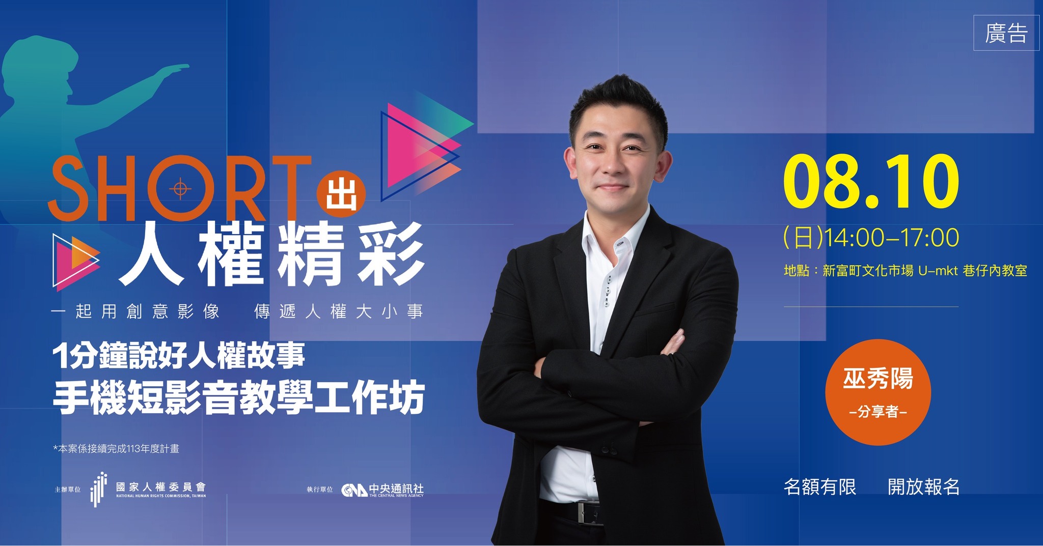 活動名稱【國家人權委員會】1分鐘說好人權故事 手機短影音教學工作坊 (8/10)活動簡介免費影音工作坊招生中:用手機剪出你的故事! 人權會邀您一起透過短影音傳播重要人權議題! 想學會如何製作吸睛的短影音,展現你的創意與觀點嗎? 你是不是也曾想過:「拍完影片不會剪怎麼辦?」 別擔心!這場由國家人權委員會主辦的人權短影音工作坊,從零開始,手把手教你手機剪輯術,三小時變身創作者! 本工作坊邀請專業影音導師親授,從概念到剪接,帶你深入掌握短影音製作的核心技法,三小時實戰操作,免費參加,限額30位,錯過可惜!活動資訊講師介紹:巫秀陽 (包福娛樂 節目製作人)活動日期:2025年8月10日 星期日,下午14:00-17:00活動對象:一般大眾活動地點:「新富町文化市場 U-mkt」巷仔內教室 (台北市萬華區三水街70號)活動主辦/承辦單位: