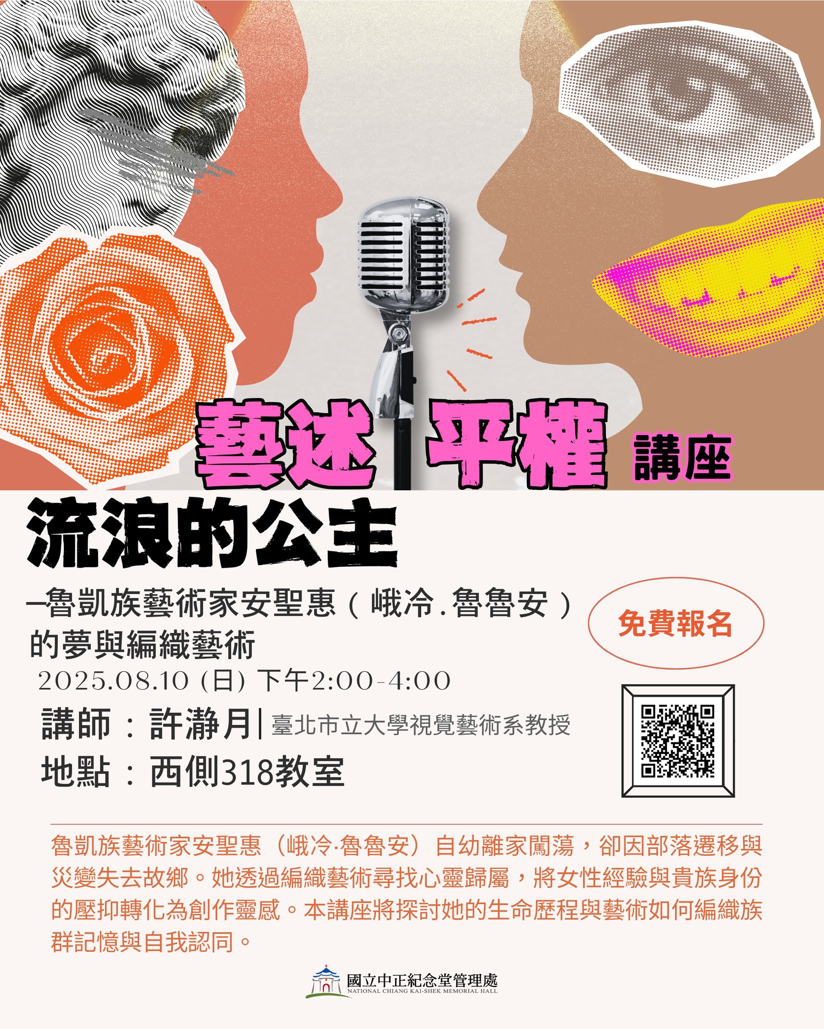 活動名稱【國立中正紀念堂管理處】流浪的公主:魯凱族藝術家安聖惠(峨冷.魯魯安)的夢與編織藝術 (8/10)活動簡介聖惠出生於屏東舊好茶部落,長大後卻選擇離鄉到城市闖蕩,直到部落歷經多次遷移與災變,她才意識到,那份來自土地與記憶的牽絆始終沒有斷開。當她重新拿起編織的線,一針一線不只是創作,更是回家的路…。本場講座邀請臺北市立大學視覺藝術系許瀞月教授,分享安聖惠如何透過編織回望童年、回應創傷,將個人生命經驗轉化為藝術實踐。活動資訊活動日期:2025年8月10日 星期日,下午14:00 - 16:00活動地點:中正紀念堂3樓W318教室活動對象:一般大眾活動主辦單位:國立中正紀念堂管理處詳細資訊:更多詳細資訊請參考網站公告