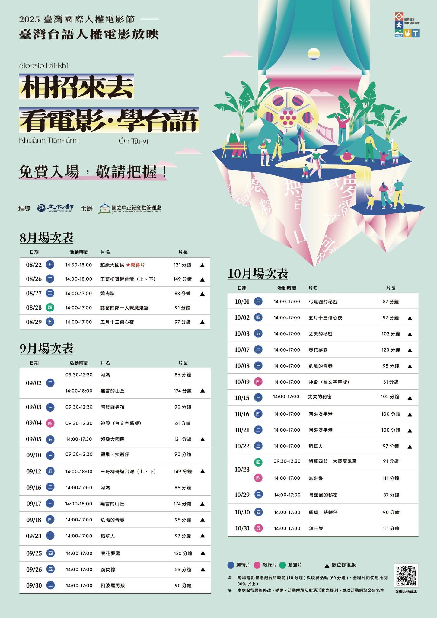 活動名稱【國立中正紀念堂管理處】臺灣台語人權電影放映 (8/22~10/31)活動簡介台語是許多長輩從小使用的語言,也是臺灣重要的文化資產。為了讓更多人重新接觸台語、認識台語之美,本活動透過電影欣賞,搭配台語映前導讀與映後分享,邀請大家一同「看電影、學台語」,在輕鬆的觀影中親近台語。