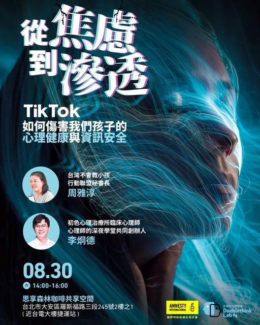 活動名稱【國際特赦組織】從焦慮到滲透:TikTok 如何傷害我們孩子的心理健康與資訊安全 (8/30)活動簡介國際特赦組織一份全球調查報告發現,深受年輕人喜愛的 TikTok,背後的演算法與內容推薦系統,除了讓人容易上癮,也讓已受心理健康困擾的兒童和年輕人暴露在有害的內容當中,甚至包含鼓勵自殺行為的影片。
