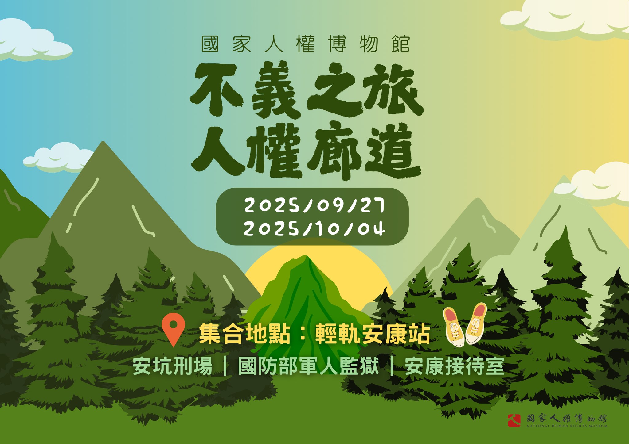 活動名稱【國家人權博物館】不義之旅—人權廊道一日走讀導覽 (9/27、10/4)活動簡介走入歷史現場|安坑刑場・國防部軍人監獄・安康接待室在離新店溪不遠的山區裡,曾經有一片不為人知的黑暗角落,無數政治犯、思想犯在此被審訊、監禁,甚至走向生命終點。我們邀請您,同我們一起踏上「人權廊道」的旅程,親自走訪安坑刑場、軍人監獄與安康接待室,直視迷霧深掩的歷史真相,反思人權的價值。活動資訊活動日期:2025年9月27日、10月4日【9月場次】