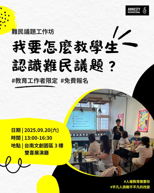 無論您是否已申請教材包,都誠摯邀請您報名參與,一起讓國際議題走進課堂,帶學生看見世界的另一端。活動資訊講師介紹:國際特赦組織台灣分會難民議題專員周雅琥、國際特赦組織台灣分會人權教育倡議專員莊苡辰活動日期:2025年9月20日 星期六,下午13:00 - 16:30活動對象:教育工作者專屬(包含但不限於國小至大學教師)活動地點:臺南市東區北門路二段16號(台南文創園區 3樓雙囍展演廳)活動主辦單位:國際特赦組織詳細資訊:更多詳細資訊請依官網公告