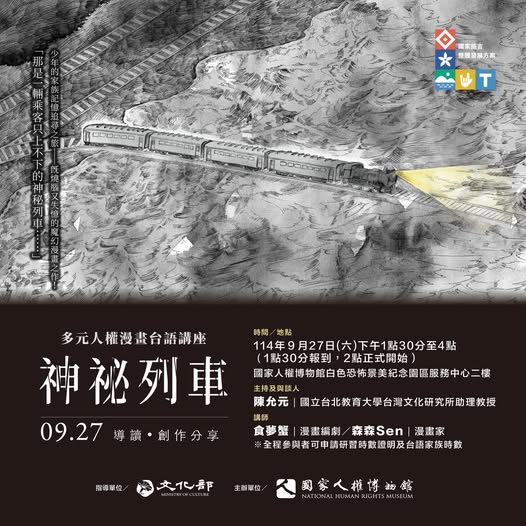 活動名稱【國家人權博物館】多元人權漫畫《神秘列車》台語講座 (9/27)活動簡介本次講座以文學改編漫畫《神祕列車》為主題,邀請漫畫編劇、漫畫家創作分享,透過少年的追尋與家族記憶,揭露一段被威權禁錮及白色恐怖的歷史傷痕。現場亦將融入台語導讀,以母語的溫度傳遞記憶與人權價值。歡迎對文學、藝術與人權議題有興趣的朋友,一同搭上「神祕列車」,在故事與交流中思索自由與記憶。活動資訊講師介紹: