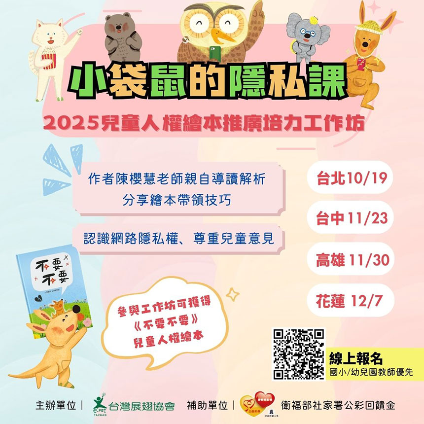 活動名稱【台灣展翅協會】小袋鼠的隱私課-兒童人權繪本推廣培力工作坊 (11/23、11/30、12/7)活動簡介台灣展翅協會長期推廣《兒童權利公約》,幫助兒童 、家長及老師認識兒少權益,我們相信,讓孩子愈早認識與自己有關的權利並內化在日常生活中,將對他們在未來成長的階段產生正向的影響。本會將於今年10月~12月於舉辦「小袋鼠的隱私課:兒童人權繪本推廣培力工作坊」,透過本會出版的兒童人權繪本教材《不要不要》,帶領幼兒園及國小教師認識網路隱私權與尊重兒童意見的內涵,同時安排本書作者親自導讀解析及分享繪本帶領技巧,培力教師學習如何有效運用本書引導孩子及家長更深入認識網路隱私的重要,共同提升數位素養意識並落實在日常生活中!活動資訊活動日期:2025年11/23、11/30、12/7,每場次3小時