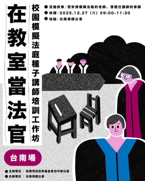 活動名稱【財團法人民間司法改革基金會】在教室當法官|校園模擬法庭種子講師培訓工作坊-台南場 (12/27)活動簡介在課堂裡,我們常常希望給學生的不只是課本知識,而是一種能陪伴他們一生的能力,像是傾聽、思考與判斷。模擬法庭,正是這樣的一種學習方式。學生透過角色扮演與辯論,嘗試理解司法制度,也在討論中學習尊重不同意見,體會如何在多元觀點裡找尋答案。法律因此不再只是書頁上的文字,而成為貼近生活的練習。自2015年以來,司改會和許多老師、律師一起,把模擬法庭帶進校園。課堂上,學生分組扮演檢辯雙方、法官與國民法官,證人接受交互詰問,律師講師則協助引導程序。最後,由學生組成的國民法官展開評議,彼此討論、相互說服。在這樣的過程裡,學生不只挑戰「無罪推定」等司法原則,更練習在公共議題裡保持冷靜與理性,這些都是他們未來作為公民的重要養分。2025年,我們希望把這份資源分享給更多學校。工作坊裡,我們會介紹司改會推動法治教育的經驗,邀請曾合作的老師與律師分享課堂故事,也將帶領大家實際體驗模擬法庭。今年的新劇本特別以性別議題為核心,讓學生能在課堂上觸碰多元的社會面貌,並從中思考如何與他人共處。活動資訊講師介紹: