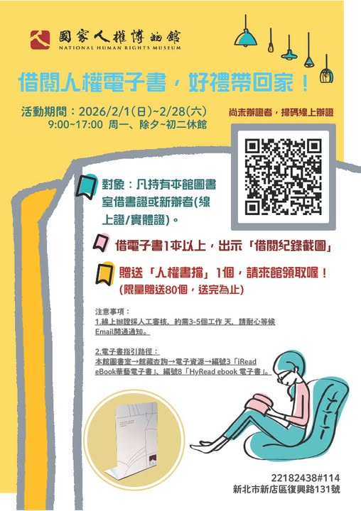 活動名稱【國家人權博物館】借閱人權電子書,好禮帶回家 (2/1~2/28)活動簡介國家人權博物館自113年11月9日開放圖書室以來,提供多元人權研究素材和相關議題入門圖書,兼衡專業者研究需要及一般大眾可近性。為持續建構實體與數位並重的數位人權圖書室,蒐集多元人權圖書、視聽資料,並提供讀者跨越場域與時間限制的閱讀選擇,人權館圖書室今年正式推出電子書閱覽服務,將館藏延伸至數位空間。本館讀者可透過圖書室網站,點選HyRead ebook和iRead eBook電子書平台進行線上借閱,隨處、隨時享受閱讀的便利。活動資訊活動日期:2026年2月1日至2月28日 每日9:00 - 17:00 (周一及除夕2月16日至初二2月18日休館)。活動對象:一般大眾活動地點:國家人權博物館圖書室 (新北市新店區復興路131號)活動主辦單位:國家人權博物館詳細資訊:更多詳細資訊請參考網站公告