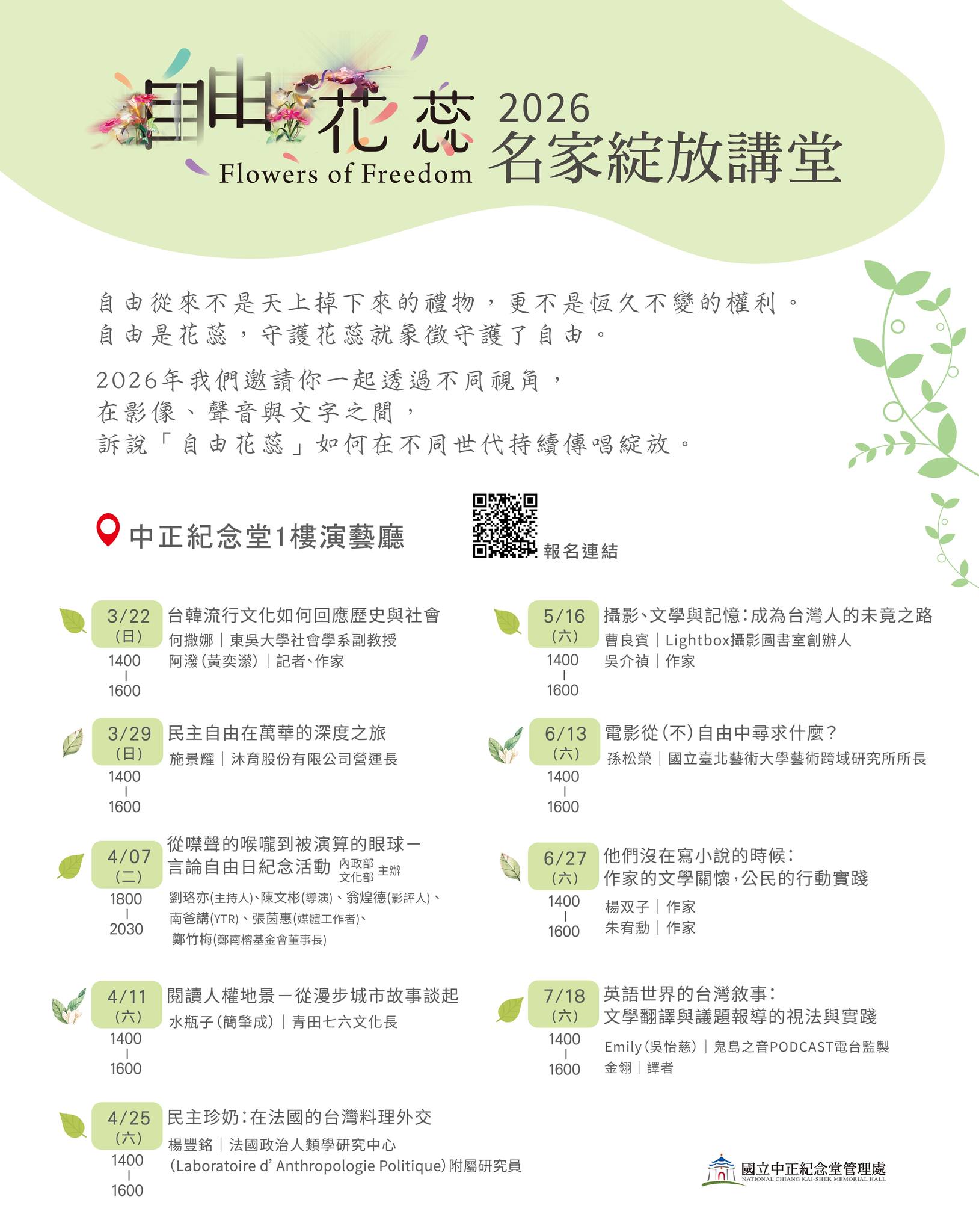 活動名稱【國立中正紀念堂管理處】閱讀人權地景—從漫步城市故事談起 (4/11)活動簡介中正紀念堂「自由花蕊」常設展以自由如花蕊為寓意,展示從1945年至今臺灣人民追求民主自由的歷程,呈現臺灣今日自由繁榮的背後,如何澆灌開創出民主自由的花蕊,適合高中、國中及國小高年級學生校外教學。萬華不只是臺北知名的老街區,更見證台灣民主變遷發展;跟著萬華第五代囡仔,從艋舺城區的歷史現場,探索民主在老街留下的印記。由文化轉譯家艋舺人施景耀主講,帶觀眾了解從艋舺城區的歷史現場,探索民主在老街留下的印記,艋舺不僅是知名老城,更是台灣民主發展變遷的見證者。活動資訊講師介紹:水瓶子(簡肇成)|青田七六文化長活動日期:2026年4月11日 星期六,下午14:00 - 16:00活動報名:前往報名活動地點:中正紀念堂1樓演藝廳活動對象:一般大眾活動主辦單位:國立中正紀念堂管理處詳細資訊:更多詳細資訊請參考網站公告