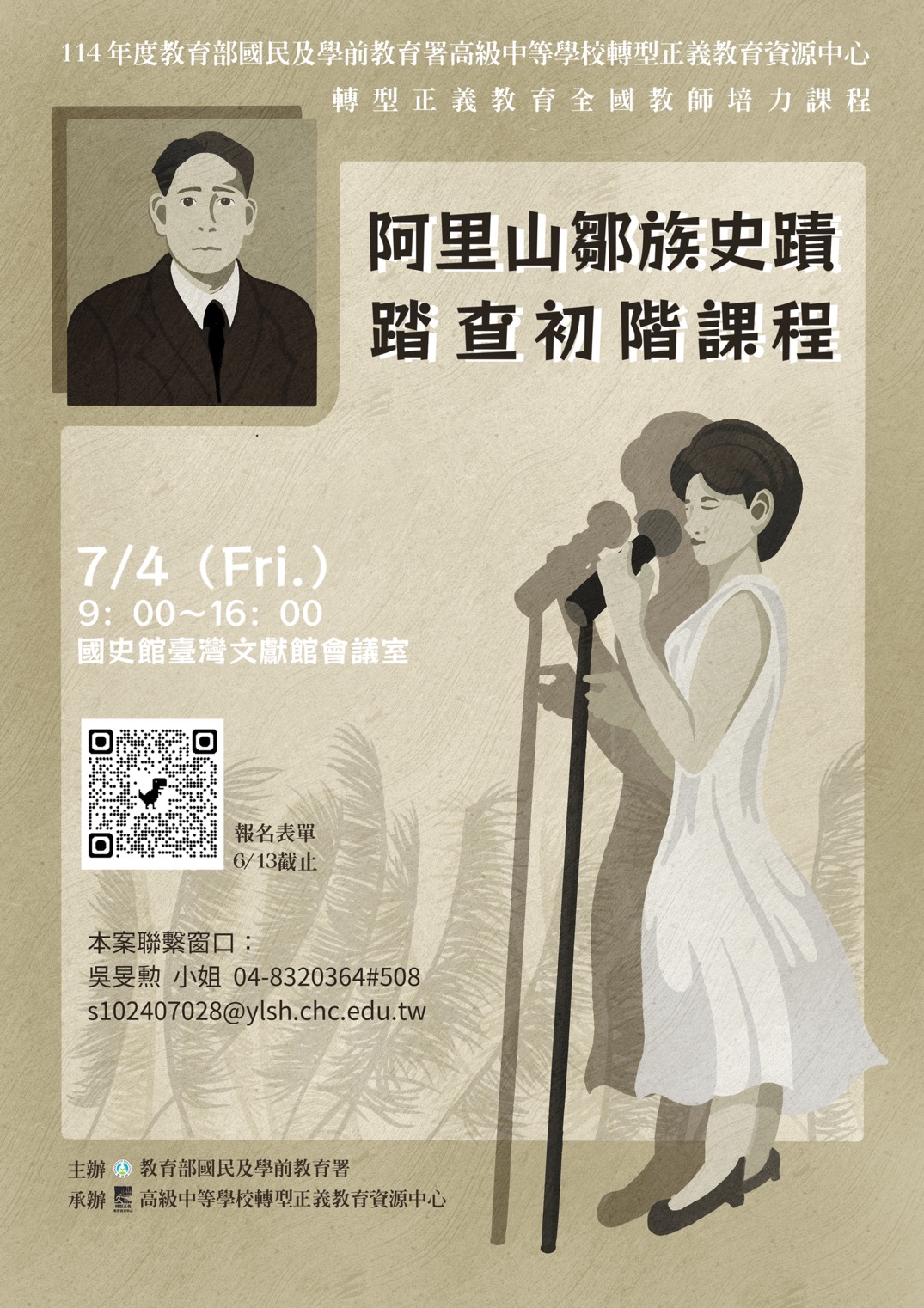 活動名稱【轉型正義教育資源中心】114年度全國教師培訓課程:阿里山鄒族史蹟踏查初階課程 (7/4)(6/13截止報名)活動簡介今(114)年度下半年,本中心以「原住民族轉型正義」為培力課