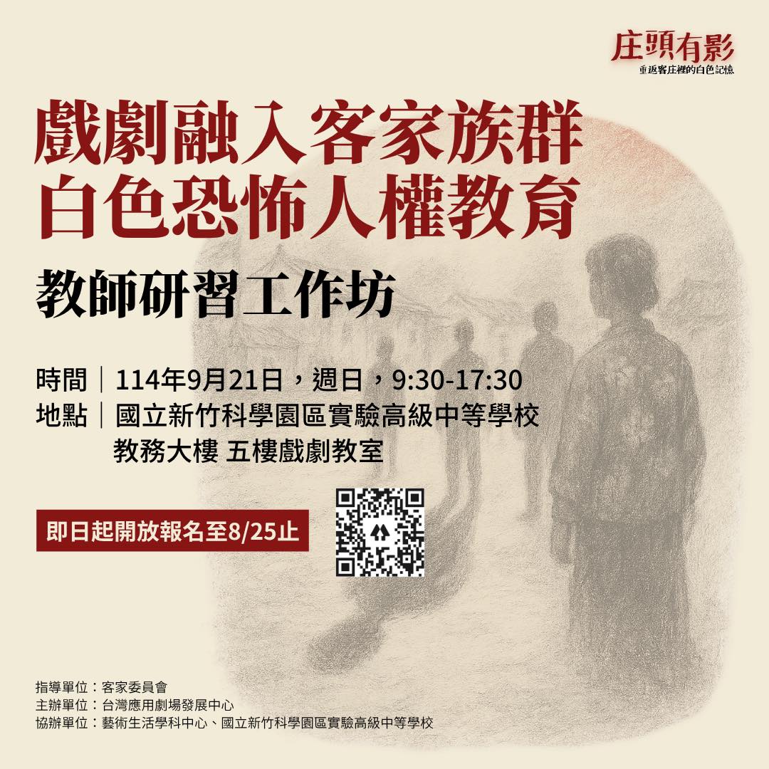 活動名稱【台灣應用劇場發展中心】戲劇融入客家族群白色恐怖人權教育—教師研習工作坊 (9/21)(8/25截止報名)活動簡介客家人在白色恐怖時期的故事,曾被時代的沉默所遮蔽。對當代的學生而言,這段歷史往往過於遙遠而難以共感。那麼,教師該如何將客家族群在白色恐怖時期的人權議題,轉化為學生能夠理解並產生共鳴的學習經驗呢?戲劇是有效的教學工具!台灣應用劇場發展中心特別規劃「戲劇融入客家族群白色恐怖人權教育——教師研習工作坊」,引領教師體驗戲劇手法,如何引動學生挖掘客家庄裡的白色記憶,讓學生不再只是旁觀者,而能投入其中、深刻體會並勇於表達,共同討論屬於自己家鄉的族群歷史!活動資訊活動日期:2025年9月21日 星期日,9:30 - 17:30活動地點:國立新竹科學園區實驗高級中等學校 教務大樓 五樓戲劇教室(新竹市東區介壽路300號)活動對象:任教於桃園、新竹、苗栗地區的高中職教師,限25人活動指導/主辦單位: