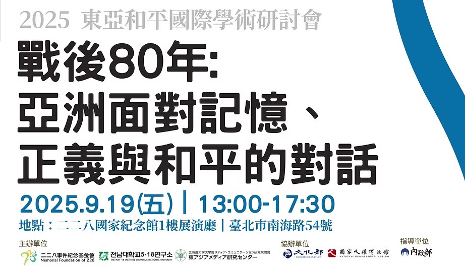 活動名稱【二二八事件紀念基金會】2025東亞和平國際學術會議 (9/19)活動簡介2025年為第二次世界大戰結束80週年,對亞洲各國而言,這場戰爭不僅代表殖民體制與軍國主義的崩解,更標誌著新時代政治秩序與社會運動的開展。戰後亞洲各地在追求民主化過程中,歷經不同程度的威權統治、政治暴力與集體創傷;然而,各國人民亦在漫長的歷史中持續努力尋求真相、伸張正義,並以記憶為基礎構築和平的未來。本會長期關注臺灣歷史記憶的保存與轉型正義的推動,並與亞洲各地追求民主與人權的機構保持交流合作。值此戰後80年重要歷史節點,本基金會與韓國全南大學5·18研究所、日本北海道大學東亞傳媒中心將共同舉辦國際學術研討會,邀集臺日韓學者、歷史工作者與記憶運動實踐者,從多元視角討論戰後亞洲的歷史記憶、正義實踐與和平建構。活動資訊活動日期:2025年9月19日 星期五,下午13:00 - 17:30 (12:30開放入場)活動對象:一般大眾活動地點:二二八國家紀念館1樓展演廳(臺北市南海路54號)活動指導、主辦、承辦、執行單位:
