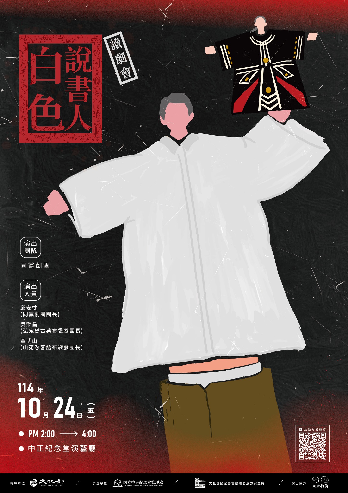 活動名稱【國立中正紀念堂管理處】《白色說書人》讀劇會 (10/24)活動簡介《白色說書人》的編創概念以戒嚴時期的創痛為敘事背景,發想曾被白色恐怖糾纏的主角父子,將會怎樣雜揉自身生命經歷、恐懼與慾望,並將其情感投射在俠義故事角色廖添丁身上。在編劇靈感構思上,發揮說書人最大的自由向度,發想角色跌宕起伏的生命歷程與白色恐怖獄中的事蹟,藉由廖添丁的布袋戲偶,主角得以在戲中與自己最鍾愛的故事角色重逢,只是這一次,說書人的聽眾,只有他自己一人。