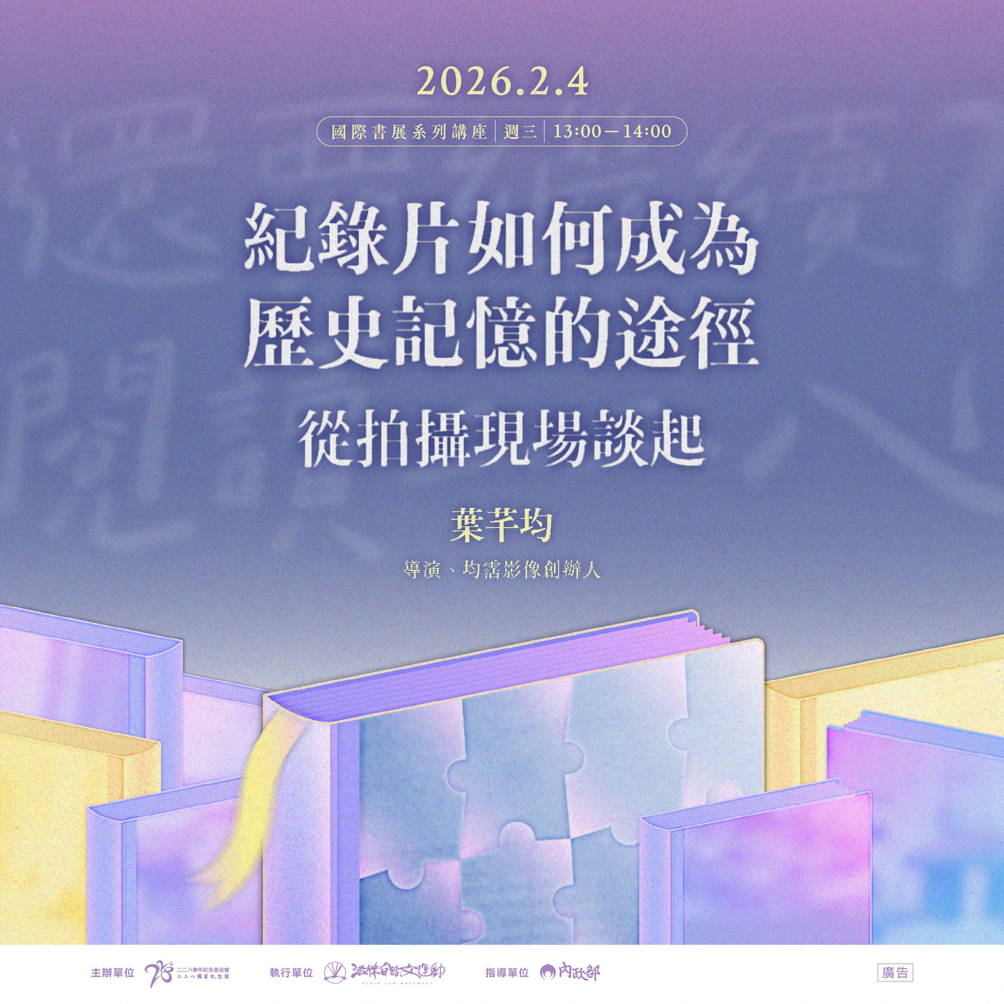 活動日期:2026年2月4日 星期三,13:00 - 14:00活動對象:一般大眾活動地點:臺北世貿一館 C728 攤位(台北市信義區信義路 5 段 5 號 1 樓)活動主辦單位:二二八事件紀念基金會詳細資訊:更多詳細資訊請參考網站公告