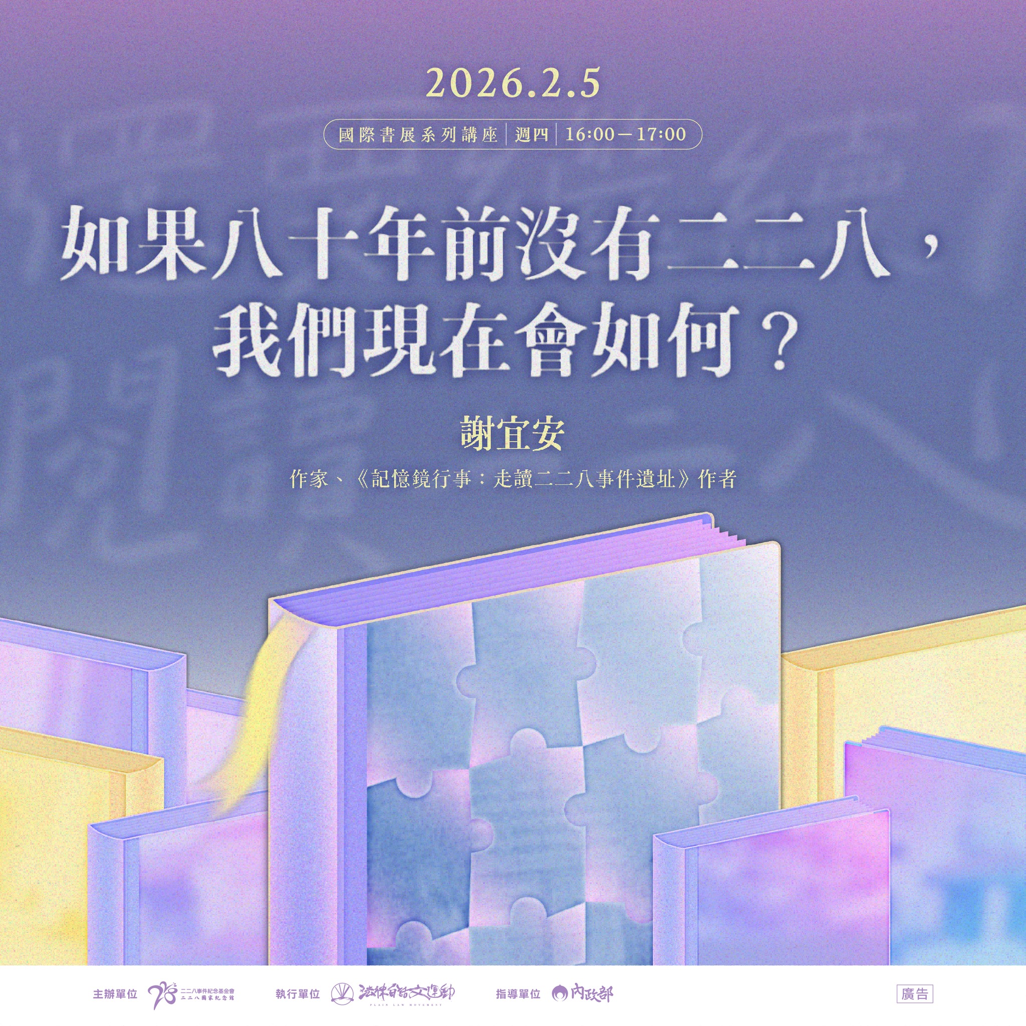 活動名稱【二二八事件紀念基金會】如果八十年前沒有二二八,我們現在會如何? (2/5)活動簡介如果沒有發生二二八,台灣現在會有什麼不一樣嗎?