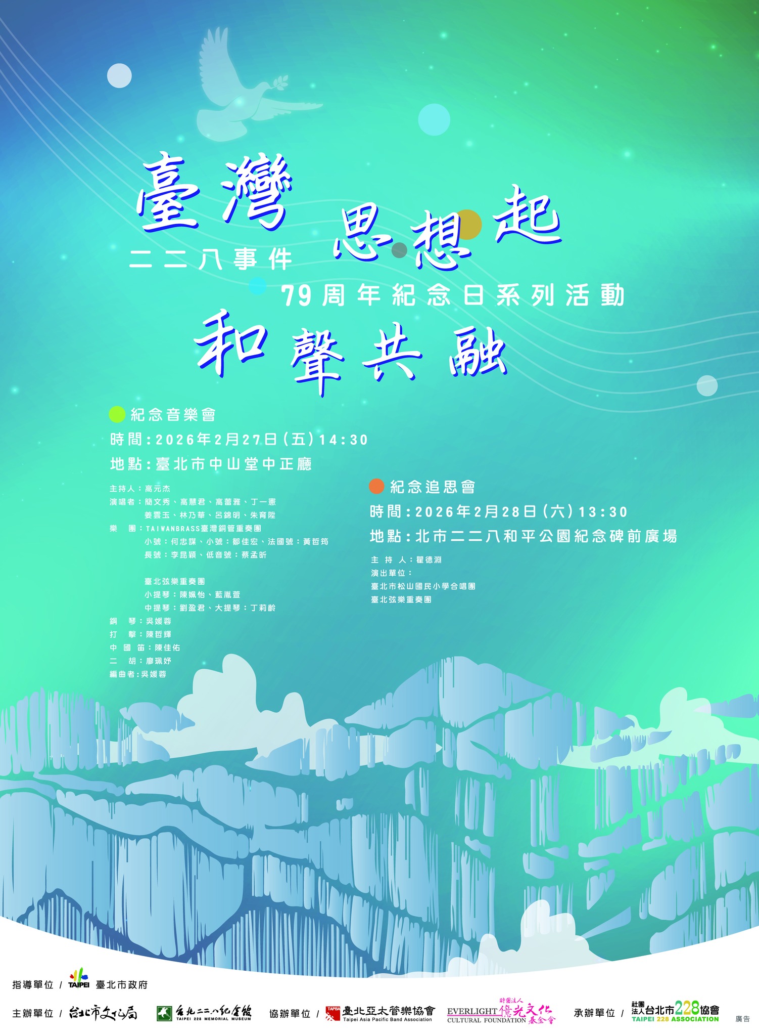 活動名稱【台北二二八紀念館】二二八事件 79 周年《臺灣思想起 和聲共融》紀念音樂會 (2/27)活動簡介歷史的傷痕,我們用溫柔的音符撫平;土地的記憶,我們用誠摯的旋律接續。二二八事件不僅是台灣歷史上深刻的刻痕,更是我們學習共融、擁抱和平的起點。