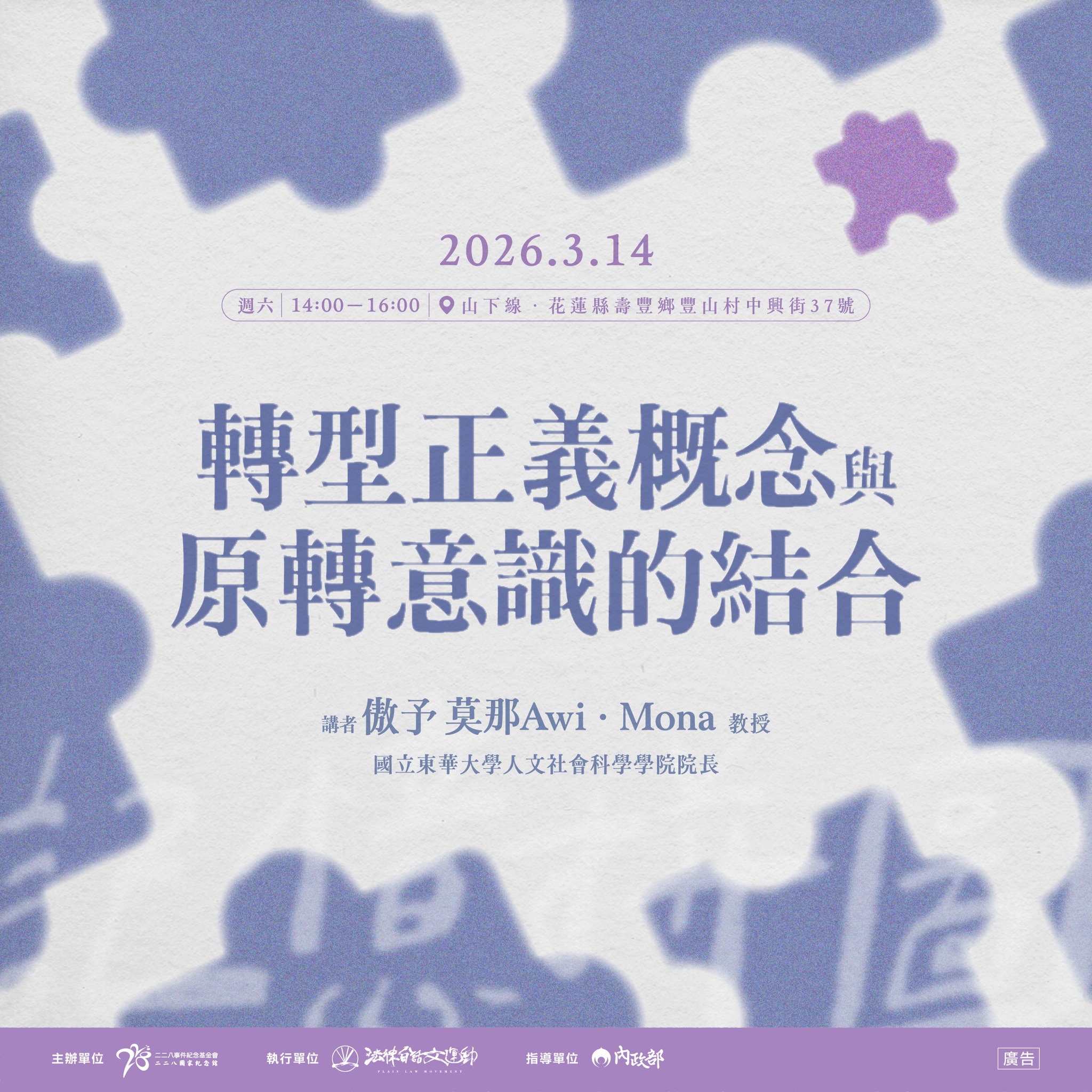 活動名稱【二二八事件紀念基金會】轉型正義概念與原轉意識的結合 (3/14)活動簡介轉型正義對於民主社會來說,是要好好面對威權時期政治對於人民的壓迫與後續造成的社會分裂的重要工程。而對於原住民族來說,在台灣歷史中所面對的壓迫具有具雙重性,包含過去日本長期殖民的各種統治手段所造成的結構性傷害,以及戰後威權時期,中華民國政府造所實施的國家暴力。因此,要落實原住民族的轉型正義,需要在對於族群文化有更完整認識的基礎下,去理解威權體制對原住民族造成的個人權利和集體權利的侵害。除了行政院在 2025 年核定戰後原住民族轉型正義強化方案,以「建立基礎工程、擴大調查研究、修復彌補措施」為目標,邀請歷史、政治、社會學專家及原住民族代表參與,希望能進一步完整原住民族的轉型正義工程外,我們還有什麼能做的,以進一步達到這些目標呢?本場講座我們邀請到東華大學人文社會科學學院院長傲予 莫那 Awi · Mona 教授,與我們一同分享,如何才能夠真的將原住民族轉型正義意識與轉型正義的概念結合。活動資訊講師介紹:傲予 莫那 Awi · Mona 教授(國立東華大學人文社會科學學院院長)活動日期:2026年3月14日 星期六,14:00 - 16:00活動對象:一般大眾活動地點:山下線(花蓮縣壽豐鄉豐山村中興街37號)活動指導/主辦單位: