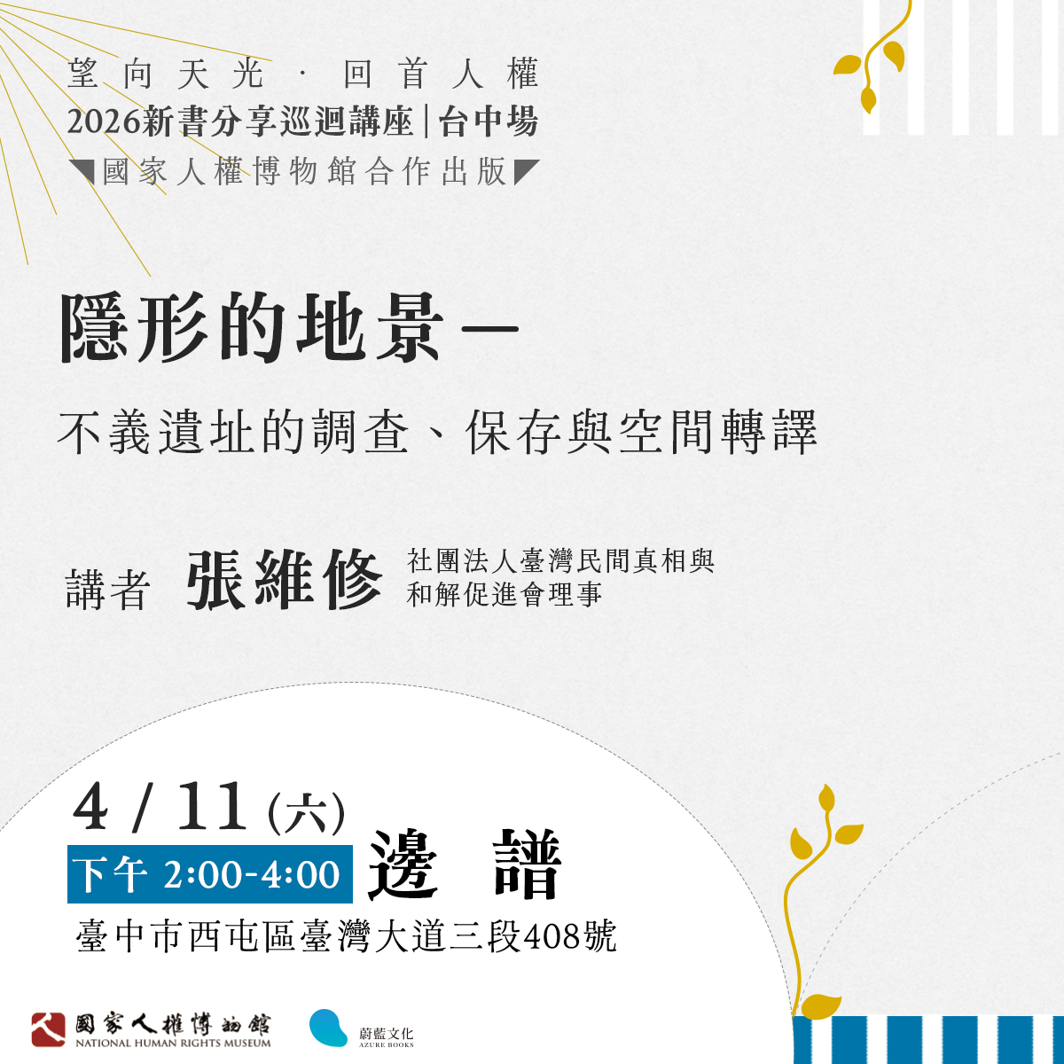 這不只是建築專業的分享,更是一次對島嶼記憶的深度打撈。誠摯邀請您與張維修老師一起,在日常的地景中,讀出那些不該被遺忘的生命重量。活動資訊講師介紹:張維修( 社團法人臺灣民間真相與和解促進會理事)活動日期:2026年4月11日 星期六,下午14:00 - 16:00活動對象:一般大眾活動地點:臺中市西屯區臺灣大道三段408號活動主辦單位:國家人權博物館詳細資訊:更多詳細資訊請參考網站公告