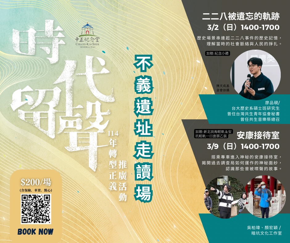 活動名稱【國立中正紀念堂管理處】不義遺址走讀路線B:安康接待室 (3/9)(3/3報名截止)活動簡介本處規劃20場轉型正義活動,鼓勵社會大眾多元參與,以共同討論、互動分享與傾聽,在轉型正義的反思過程中,凝聚對人權與民主價值的共識,進而實現普世之人權關懷。除走讀活動每人新臺幣200元整(含單程交通費、保費、小點心),其餘活動均為免費。