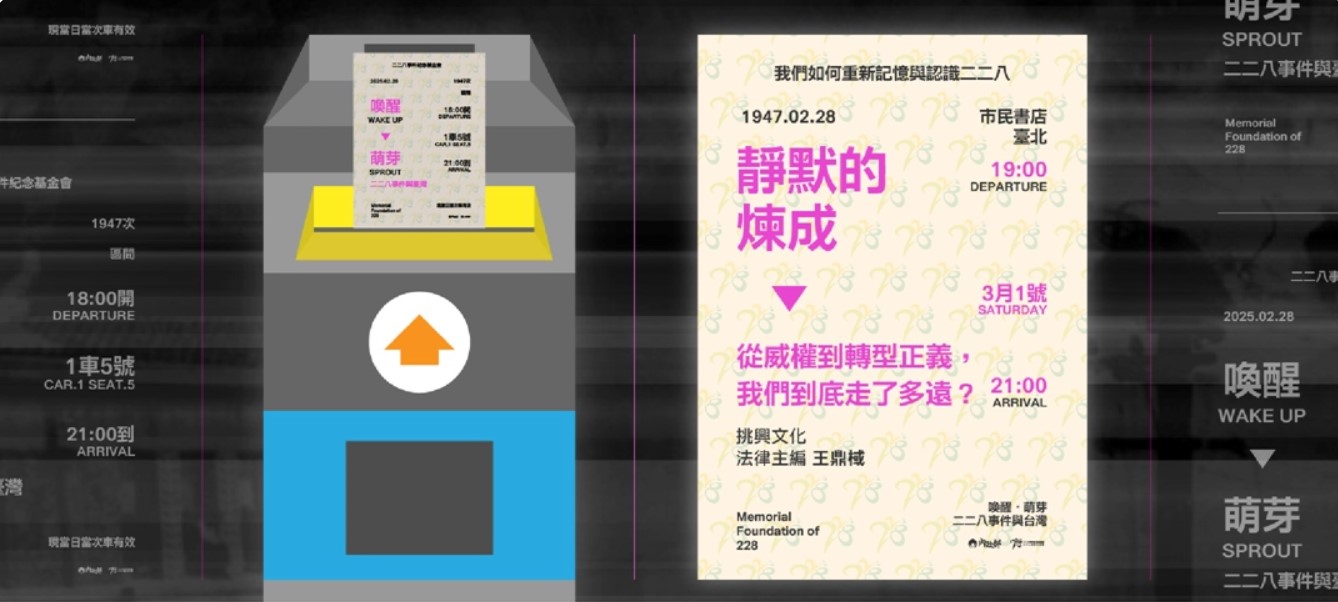 活動名稱【二二八事件紀念基金會】 《靜默的煉成:從威權到轉型正義,我們到底走了多遠?》 (3/1)活動簡介本系列【喚醒。萌芽—二二八事件與台灣巡迴講演】,將於全台北、中、南、東部各地區舉辦共計 12 場次,講座分為兩大主軸「我們如何重新記憶與認識二二八」與「遍地開花:各地的二二八」,並透過各領域不同從業人員與專業研究者,希望能在事件屆滿78週年之際,邀請大家認識二二八與轉型正義的各種面向,進而對這個造成台灣社會深遠影響的龐雜事件,有更深、更廣的啟發與思考。➫ 喚醒。萌芽—二二八事件與台灣巡迴講演➬