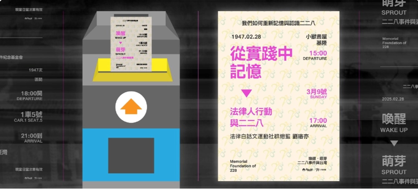 活動名稱【二二八事件紀念基金會】《從實踐中記憶:法律人行動與二二八》 (3/9)活動簡介本系列【喚醒。萌芽—二二八事件與台灣巡迴講演】,將於全台北、中、南、東部各地區舉辦共計 12 場次,講座分為兩大主軸「我們如何重新記憶與認識二二八」與「遍地開花:各地的二二八」,並透過各領域不同從業人員與專業研究者,希望能在事件屆滿78週年之際,邀請大家認識二二八與轉型正義的各種面向,進而對這個造成台灣社會深遠影響的龐雜事件,有更深、更廣的啟發與思考。➫ 喚醒。萌芽—二二八事件與台灣巡迴講演➬