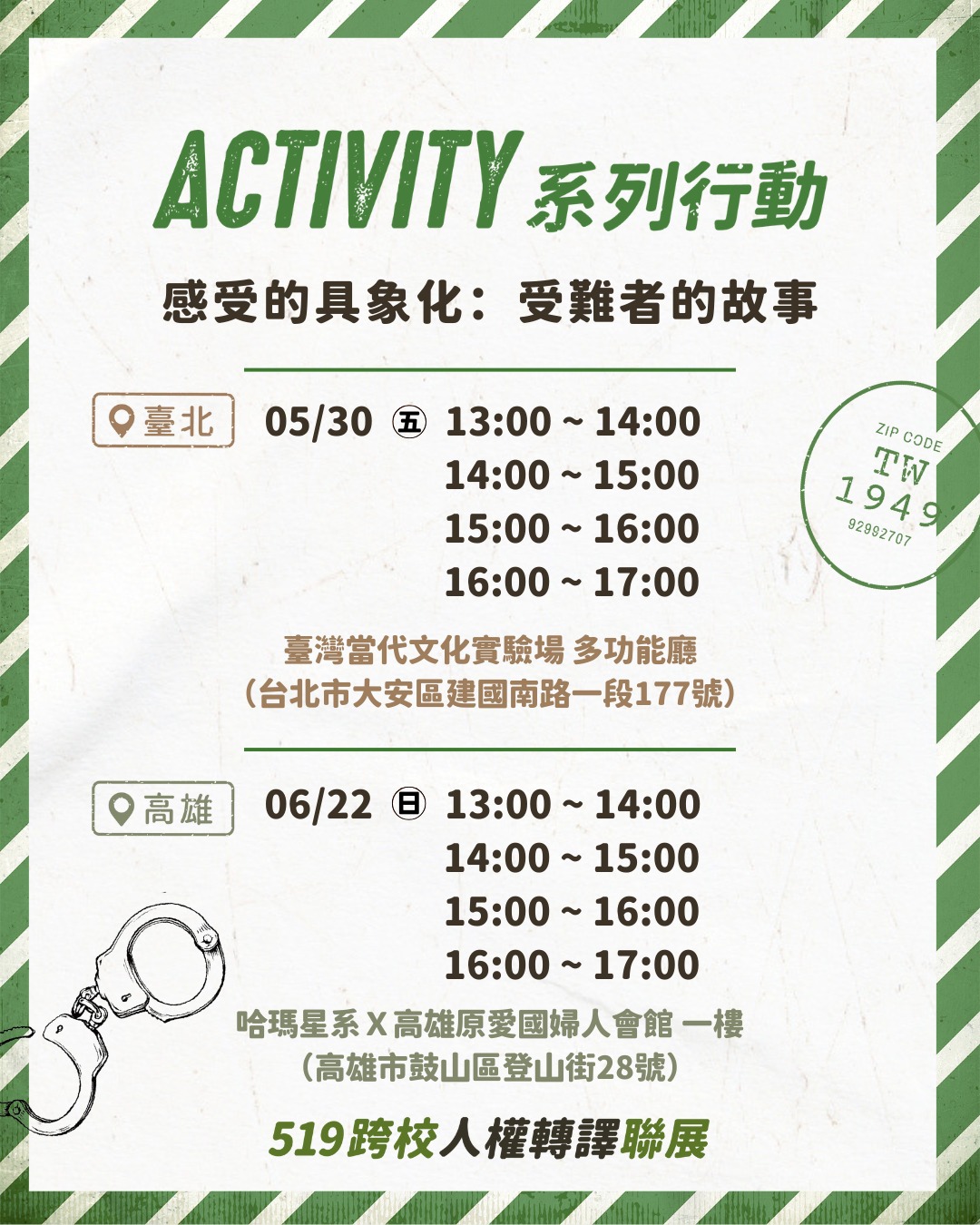 活動名稱【Action 519】感受的具象化:受難者的故事 (5/30、6/22)活動簡介看不見的感受要如何被述說?只存在於文字間的情感要如何被表現?暨大的探霧者團隊專注在探索過去的檔案,閱讀受難者們的故事,並嘗試將看不見的感受轉譯為創作作品。在這次的展覽當中,我們想要在看這篇貼文的你們來到展場參觀我們的創作,嘗試透過作品看到受難者們內心的感受,更希望你們能一起來聽我們說故事,體會故事主人翁無法說出口的感受。最後以圖像為媒介,一起建構出受難者的感受具象化。活動資訊活動日期:2025年5月30日、6月22日